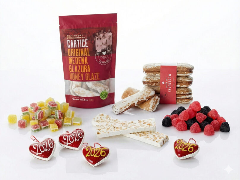 Cartice Original (1x), mehki turški med z arašidi (1x), malinino-robidni užitek (200g), žele bonbone (200g), medenjake kot nekoč (1 paket) in lectovo srce z letnico 2026 (1x).